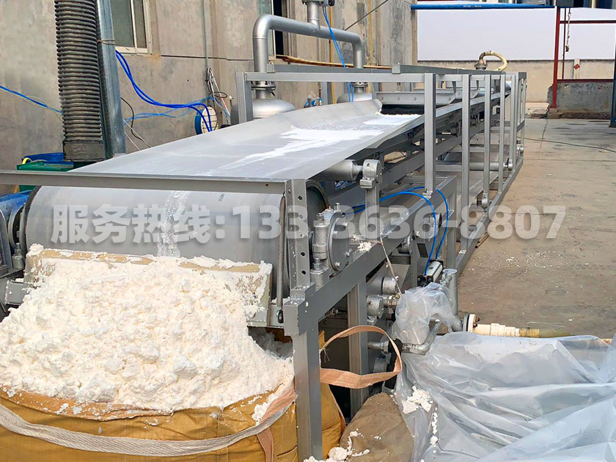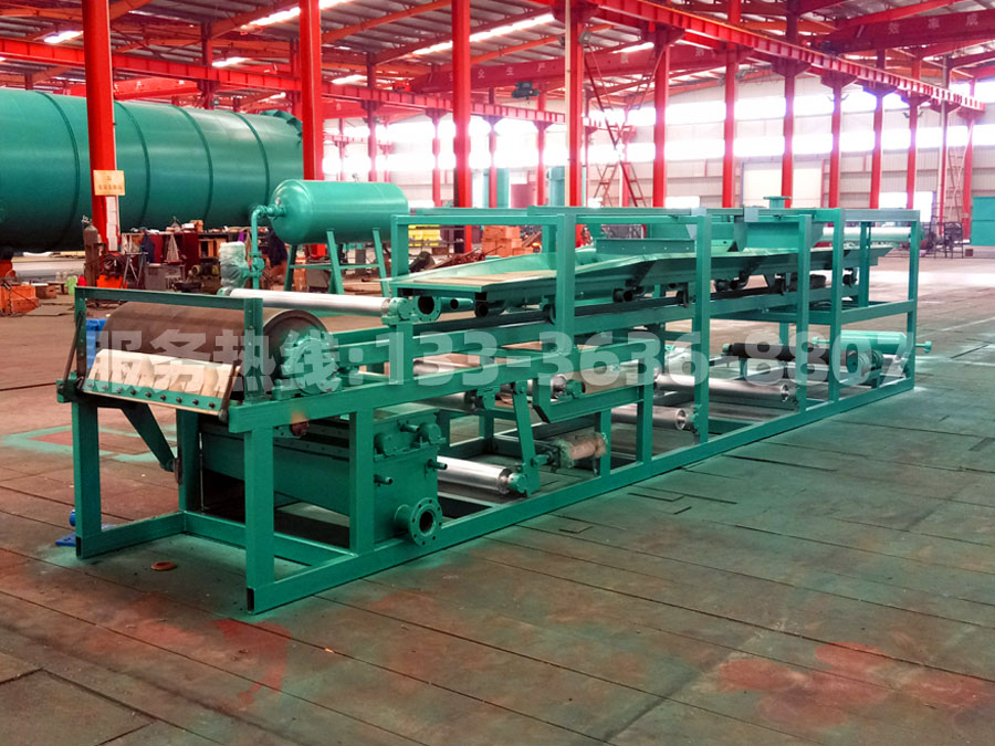 直到真空濾盤碰到接近開關裝置并切斷真空,此時真空濾盤在氣缸的拖動下迅速返回到原始位置,濾帶在電機的拖動下繼續(xù)運行,這樣周而復始進行真空抽池、洗滌、再抽濾,濾餅在卸料輥處被刮刀裝置刮離卸除,濾布經(jīng)清洗后獲得再生,再經(jīng)過一組支承輥和糾偏裝置里新進入過濾區(qū)。濾液在集液罐中隨著濾盤返回時排出。